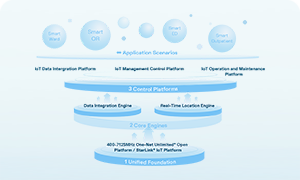It comprises 1 Unified Foundation, 2 Core Engines, and 3 IoT Platforms, supporting multi-network connectivity, intelligent device management, and big data analytics.